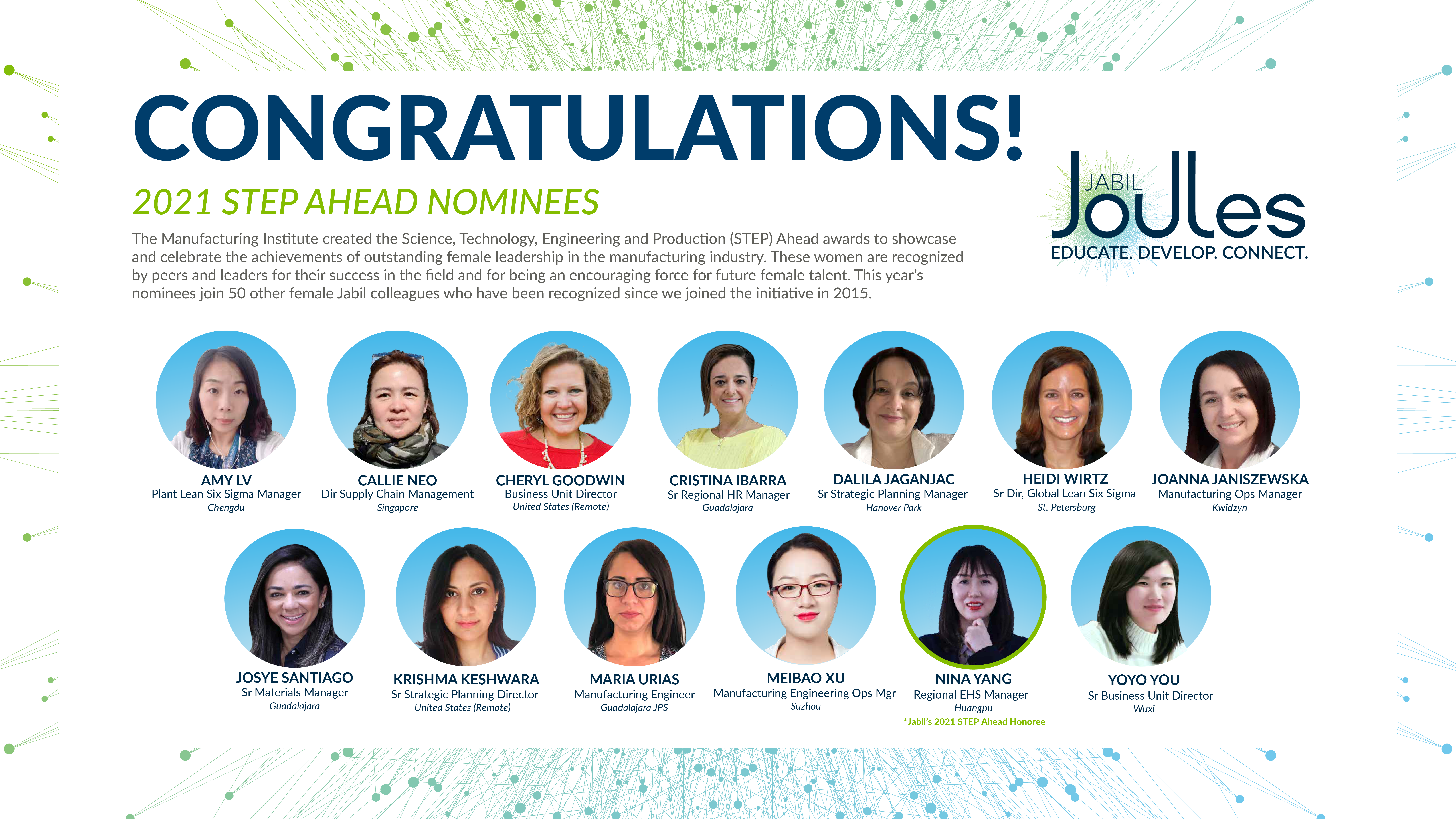 我们整个组织的女性领导者正在推动我们的业务、客户和我们经营的社区取得成功。我们很自豪地表彰由Jabil领导层提名为制造研究所2021年的一些领导人STEP Ahead奖其中一名员工和其他100名来自整个行业的女性一起成为了“2021年获奖者”。