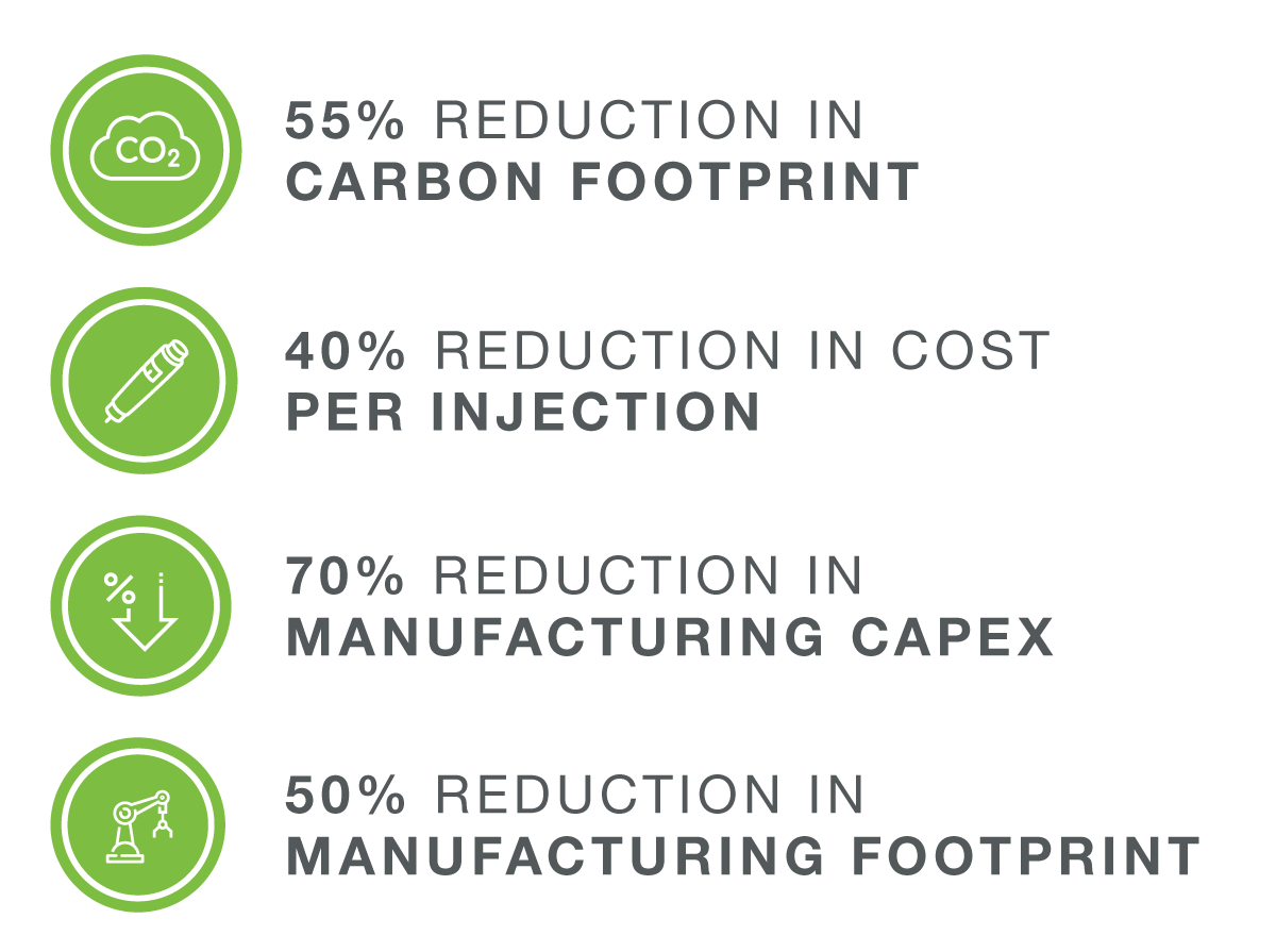 相比传统的一次性汽车喷油器在当今市场上,这种深思熟虑设计设备可持续性带来很多益处。级的材料减少约55%的可重用的自我注射器。此外,有一个更小,更简单、更低的成本制造/装配足迹,以及较低的碳足迹建立和维护这样的设施。较小的产品足迹也降低了碳足迹的冷链仓储在供应链。可重用性驱动低成本每注入一些估计高达40%。