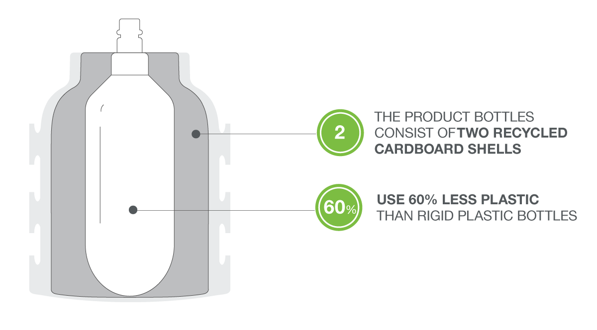 产品瓶由两个回收纸板外壳覆盖精制塑料衬套(也可回收)和使用塑料比刚性塑料瓶少60%。
