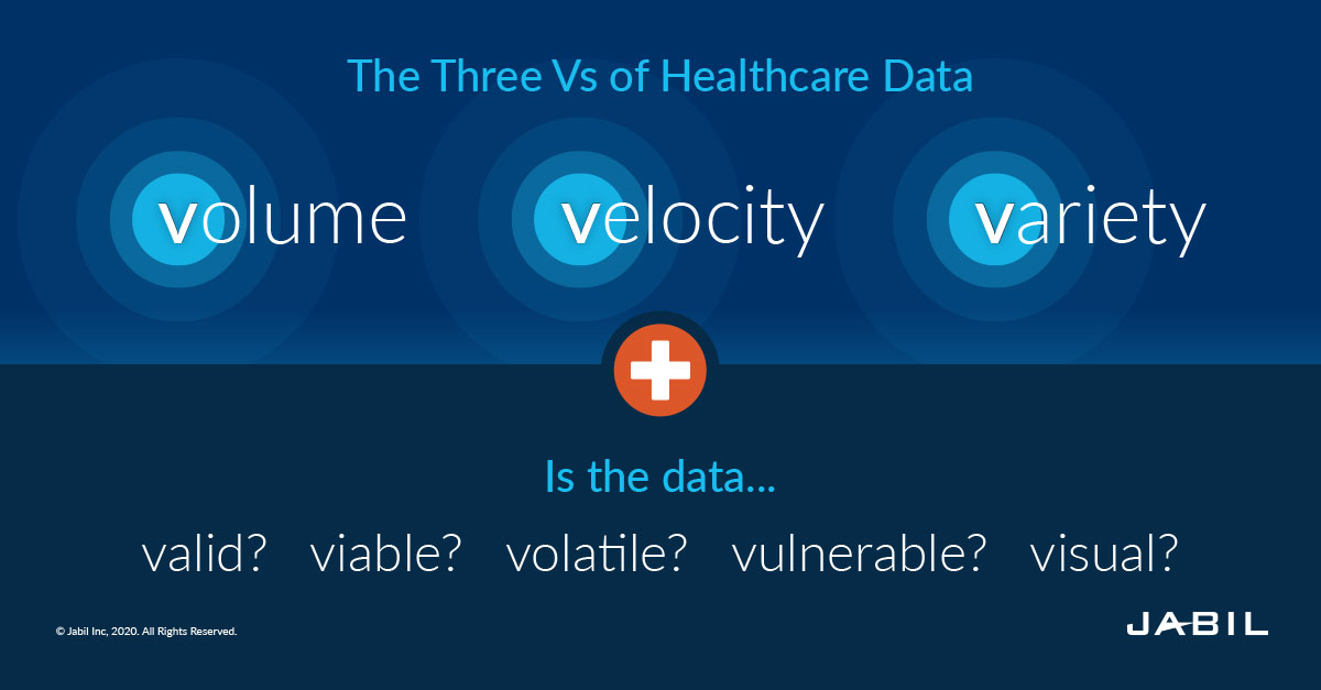 数据是否有效;我们能相信它吗?它是相关的,或者换句话说,是可行的吗?它经常变化吗?还有脆弱性。怎样才能保证数据的安全?越来越多地,特别是作为大量数字文件的函数,如何从数据中提取关键见解和分析,以可视化的方式呈现,以便患者和提供者都能理解,以支持改善健康结果?