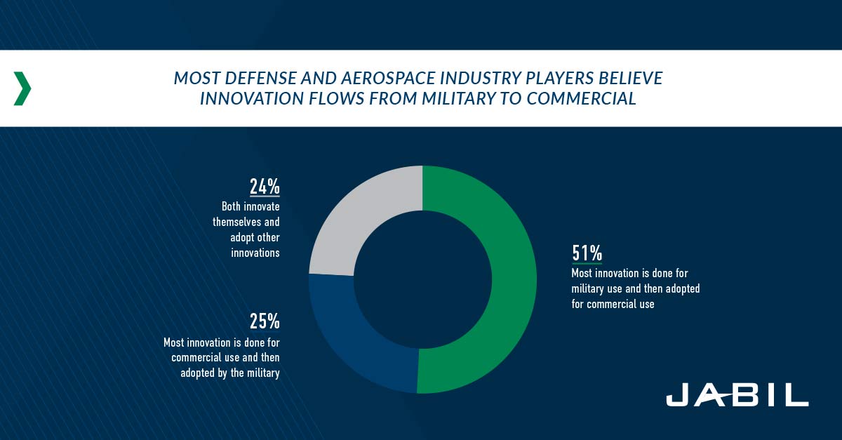 捷普集团的航空航天和国防制造趋势报告,51%的oem厂商说大多数创新都是军事用途,然后采用商业用途。因此,随着人工智能技术的出现,增强虚拟现实和物联网(物联网),我们可能不太远离回到我们最初的模型。这些技术是移动速度远大于国防工业可以跟上,这意味着它可能在该行业的最大利益来适应军事而不是试图引领创新。下载完整的调查报告。