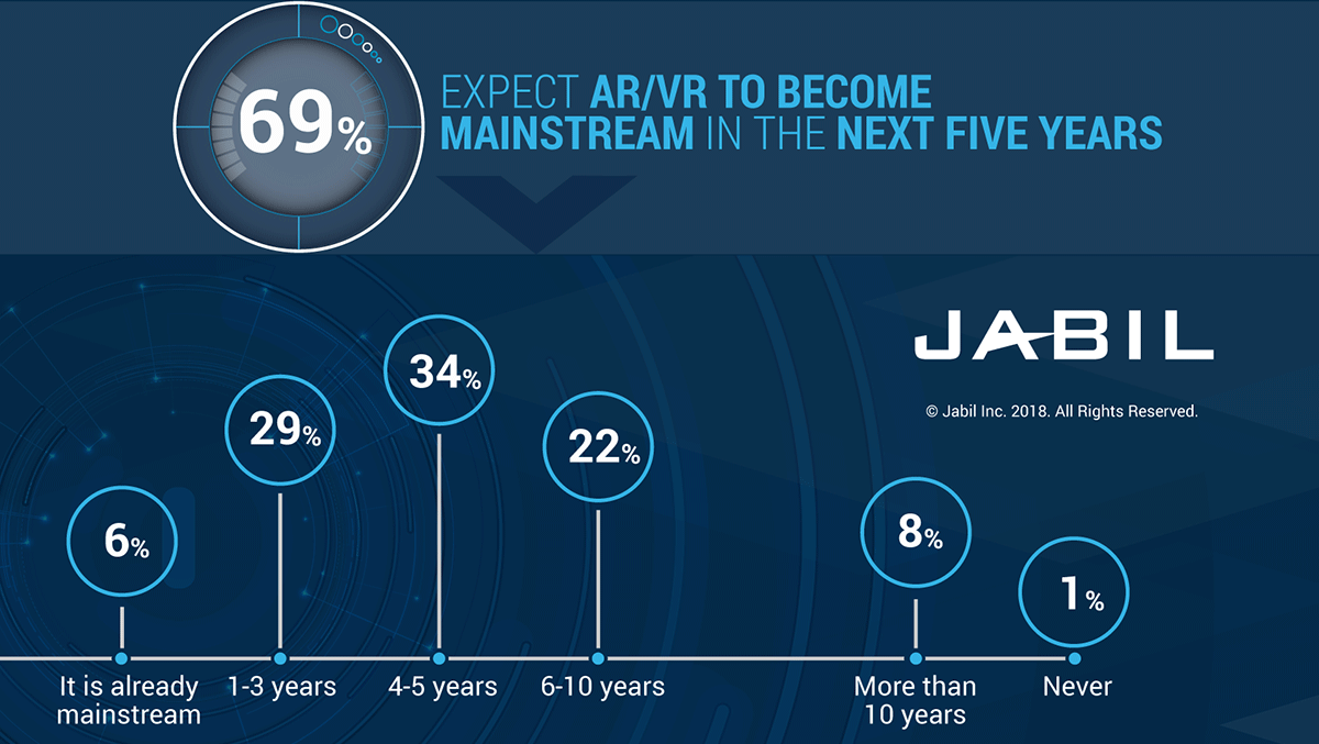 在捷普电子增强和虚拟现实技术趋势调查技术和商业利益相关者表示,消费者将首先采用AR/VR技术。最重要的是,近70%的受访者认为AR/VR将在五年内成为主流。