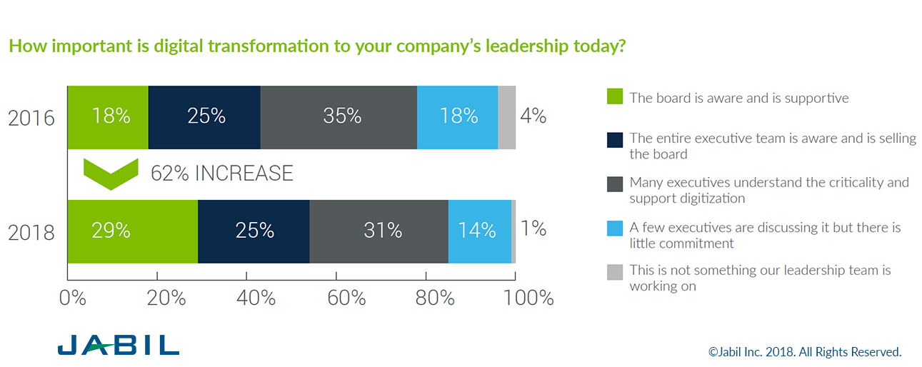 不仅整体领导可见性增加,水平的领导积极参与已经升职到会议室。在过去的两年里,最大的提高领导来自董事会的支持。2016年,小于1 5公司(18%)报告董事会层面支持他们的数字转换工作。增加到29%在2018年的调查中,一个非凡的增长62%。