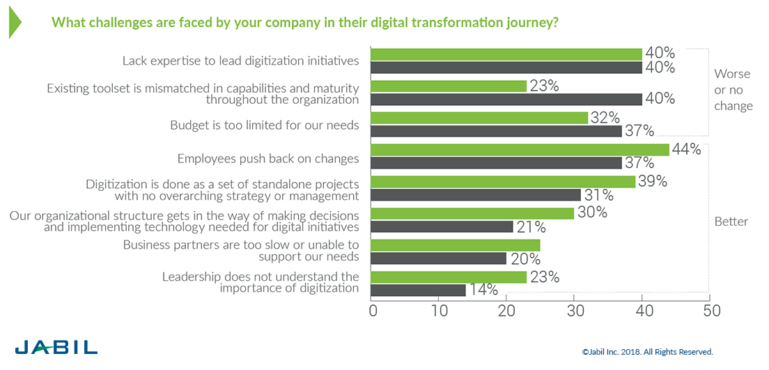 是特别有趣的,大多数报道的挑战已经看到一个显著的减少在过去的两年里,数字转换利益相关者获得经验。少正面临着组织结构等问题的决策,员工的阻力和公司领导之间缺乏理解。只有两个看到在过去的两年里增加的挑战。其中包括预算不足,现有的工具集之间的不匹配和组织能力。