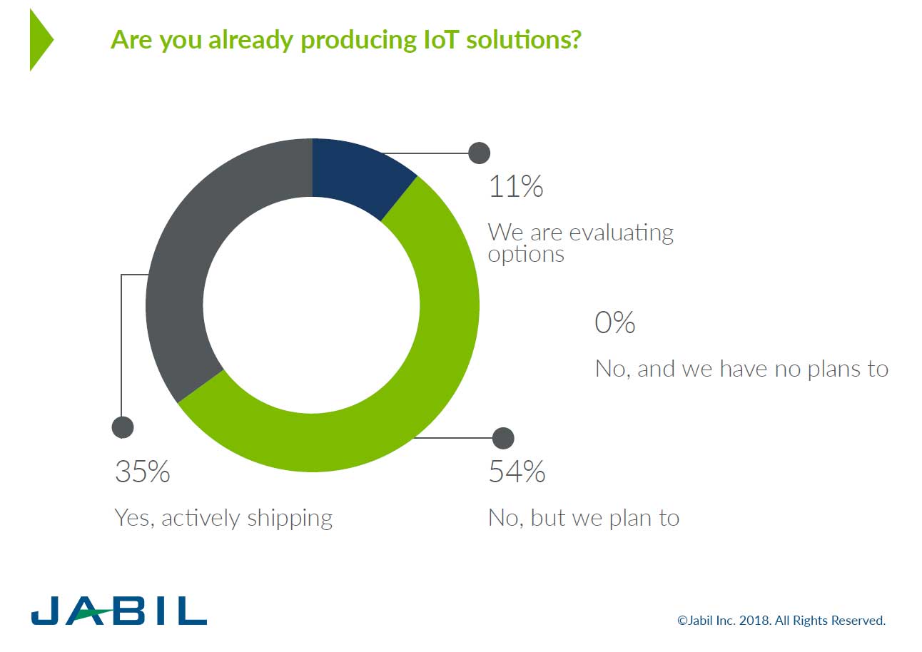 随着公司从事他们的数字转换旅程,大量的工作被完成在物联网解决方案。根据2018数字转换趋势调查由广州捷普,有一半的受访者产生模拟的解决方案的类型可以受益于物联网功能。在这些公司中,有积极的运动使产品连接。