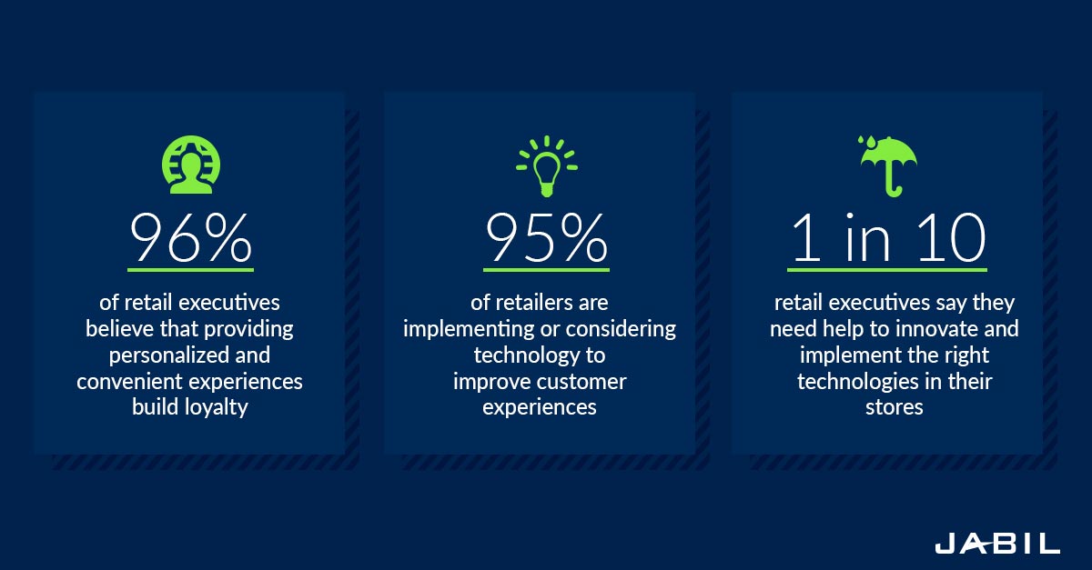 无论哪种类型的投资,所有数据都表明需要改善客户体验,这与销售额、利润率和回访顾客有直接关系。在这一努力中,96%的零售高管认为,提供个性化和便捷的零售体验可以建立忠诚度,95%的零售商正在实施或考虑使用技术来改善客户体验2018年零售技术未来调查.下载报告全文。