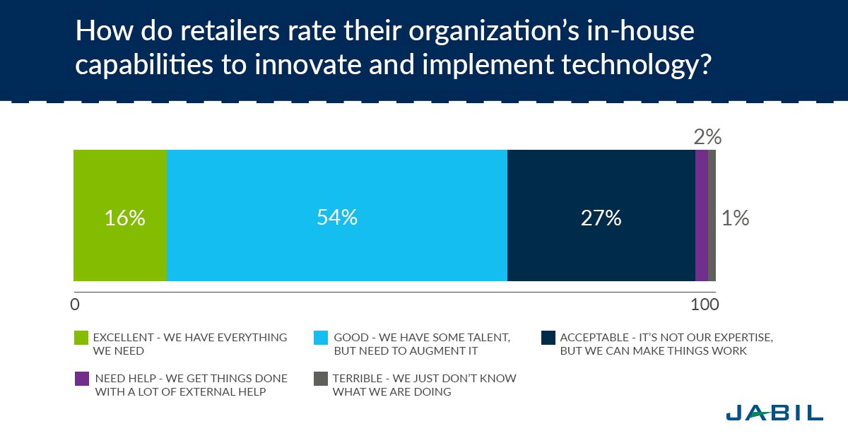 随着零售商开始将各种技术来提高存储操作,客户体验和分析,门店经理需要进行分析,以确保他们使用的有效技术。新技术可用,零售商可能会感到压力尽快实现所有的技术来保持竞争力。零售行业的共同挑战是公司想要或需要技术,但他们不知道如何正确地实现它。事实上,只有16%的零售商从广州捷普调查说他们完全相信他们的团队已经成功地将新技术的知识和资源。