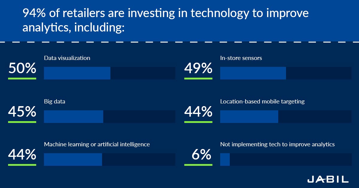 Ninety-four percent of retail leaders said that their company is implementing or considering usingtechnology to improve analytics。While there is no clear technology "winner" to improve analytics, retail brands are faced with the challenge of picking solutions, gathering hundreds or even thousands of data points and then having to translate that into actionable insight to achieve business value. This continues to be an ongoing challenge and priority for the industry.