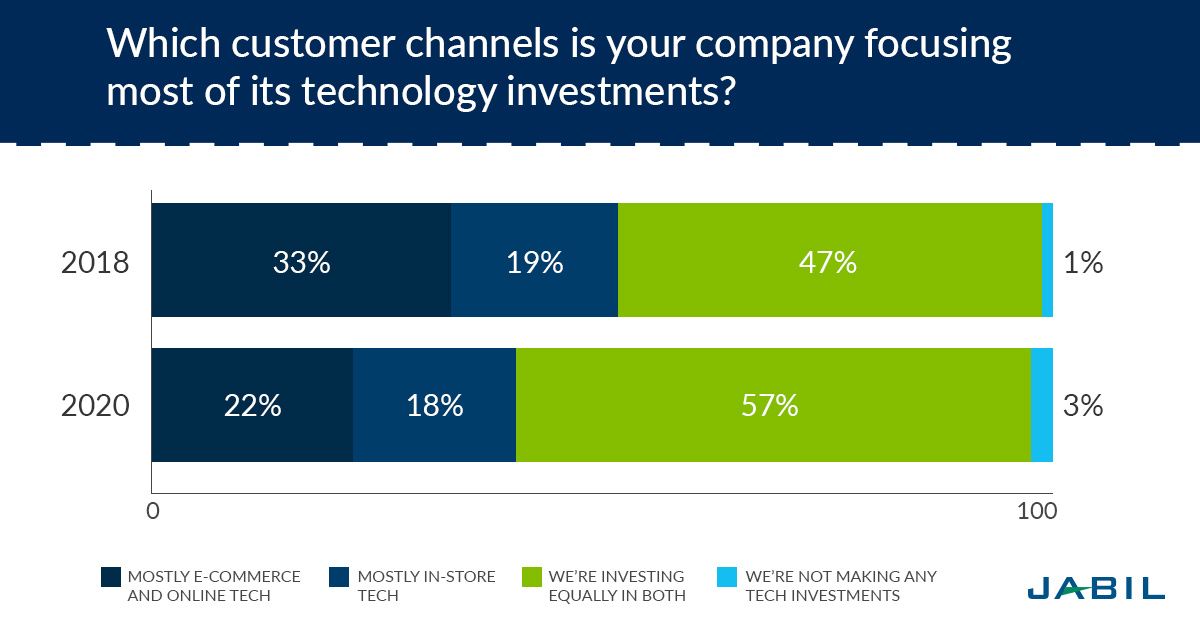 In 2018, 47% of respondents said they were investing in online and in-store technologies equally and one-third said they were focused mostly on e-commerce and online technology. This year, participants shared that they have focused their investments to a balance of in-store and online technologies to deliver a better cross-channel customer experience. Now, 57% responded that they are investing equally in both in-store and online technology; 22% answered that they are primarily investing in e-commerce and online technology; and 18% are mostly investing in in-store technology.