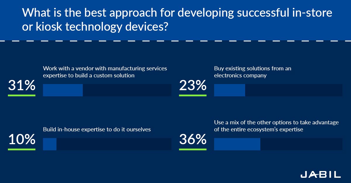 In 2020, only a third of survey respondents recognized the advantages of working with a range of technology sources. When asked about the best way to develop or implement technology, just over 30% said the best approach is to work with a manufacturing solutions provider. A little over 20% said it is to buy existing solutions from an electronics company, while 10% maintained it is to build in-house expertise to do it themselves. In addition, 36% say a mix of these practices are necessary to leverage the entire ecosystem's expertise.
