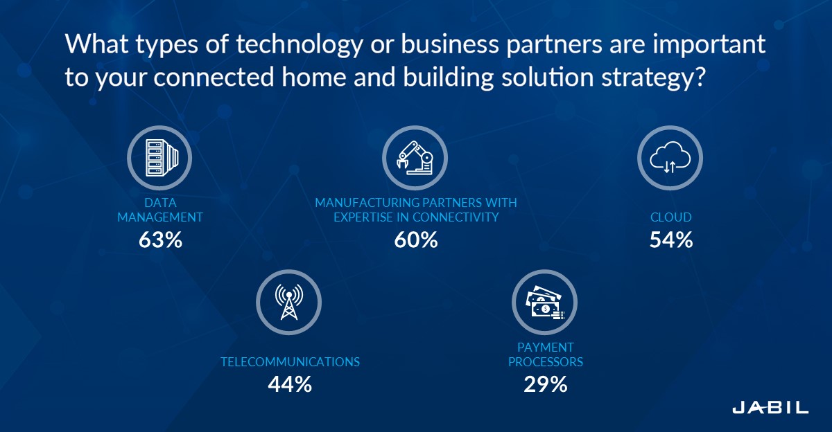 一个有效的方法来解决智能家居技术挑战是通过投资专家的帮助。几乎所有捷普电子调查参与者确定合作伙伴作为其战略的一个重要组成部分。六个受访者表示制造业合作伙伴与专业知识在连接设备连接家里的策略是至关重要的。